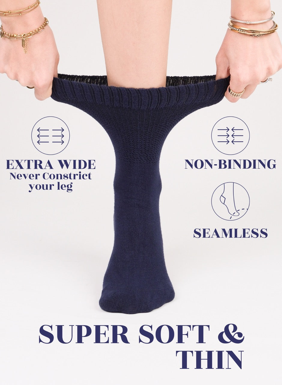 EXTRA WIDE for HEALTHY UNIMPEDED BLOOD CIRCULATION: Our seamless, non-binding, extremely EASY to PUT ON and OFF socks are highly recommended for females with pregnancy, elderly people or people with circulatory problems, diabetes, edema, neuropathy, sensitive feet or swollen ankles. Can also be used comfortably after foot surgery. They are so elastic and have a perfect amount of stretch. The loose fit and extra wide top help boost blood circulation and also prevent swelling in the feet.