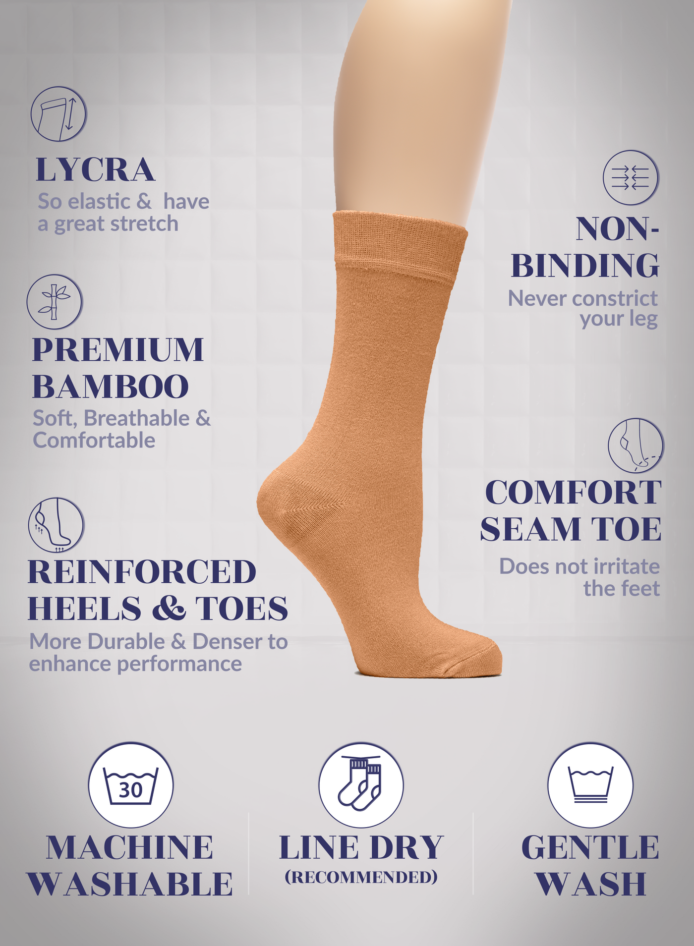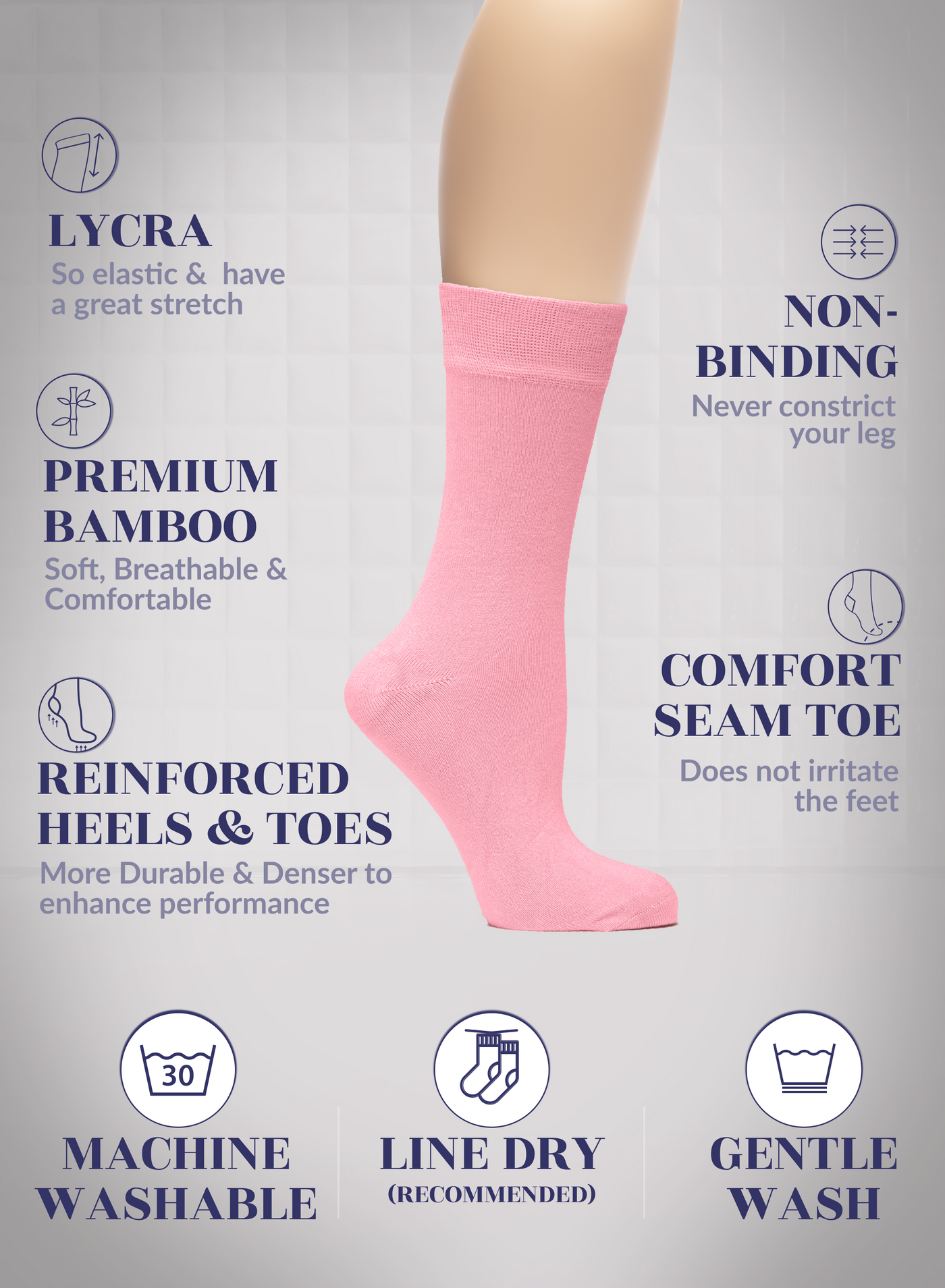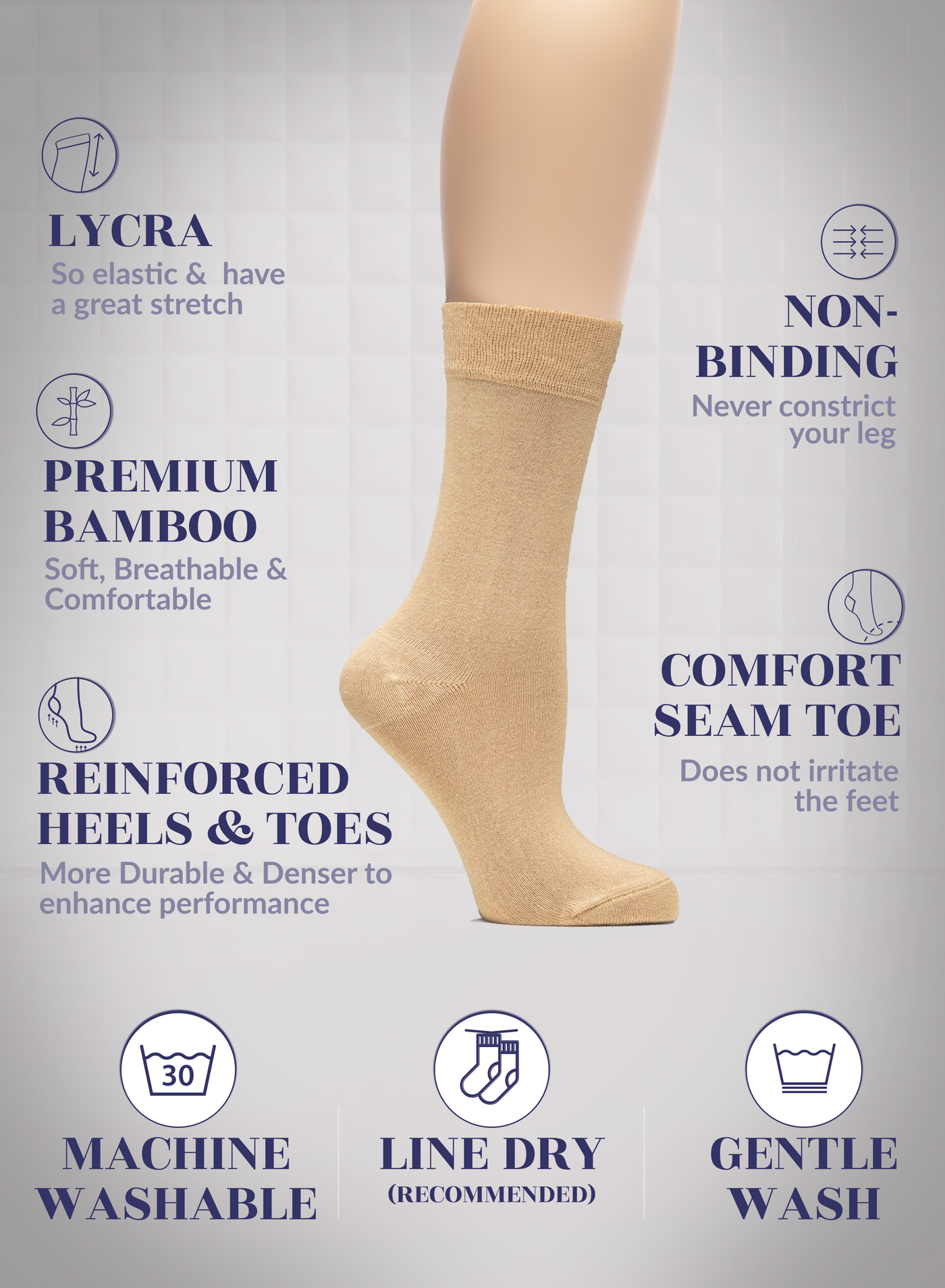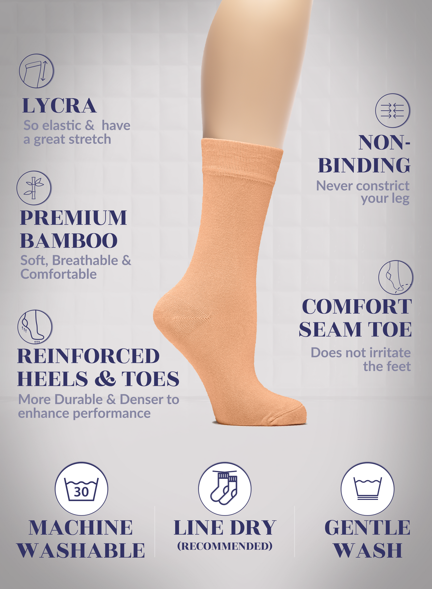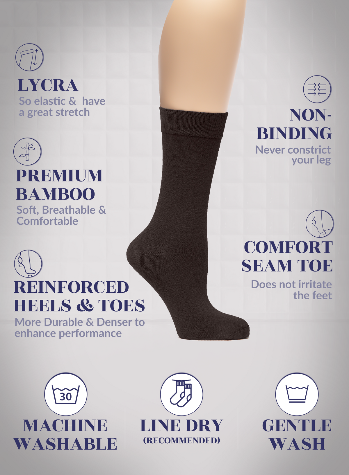 SUPER SOFT, BREATHABLE & COMFORTABLE DESIGN: Thanks to the bamboo, these thin ladies dress socks are extremely soft, breathable and has a cooling effect. They are elastic and have a great stretch. Their improved cuffs hold socks comfortably in place. Reinforced toes and heels make them extremely durable. Our business crew women dress socks have comfort seam toe that do not irritate your feet.